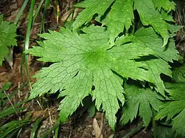 Es una planta herbácea perenne con rizoma corto y fibroso. Las hojas son basales, simples y alternas, las proximales son pecioladas y las distales son sésiles, son palmeadas con 5-11 lóbulos y márgenes serrados. Las flores son hermafroditas agrupadas en inflorescencias terminales. Tienen 3-5 sépalos blanco-verdoso sin pétalos.