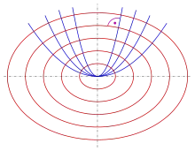 Por ejemplo, las trayectorias ortogonales de una familia de circunferencias concéntricas son las líneas que pasan a través de su centro común (ver esquema).