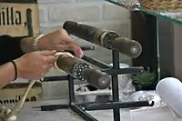 - En la primera la masa de forma cilíndrica, del grosor de un dedo, se va enrrollando alrededor del palo de madera (trdlo, de una longitud aproximada de medio metro) hasta cubrir casi por completo el trdlo.