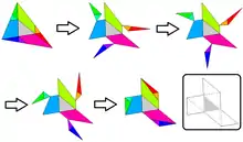 La idea de Hugo Steinhaus es que el triángulo (central) con lados p, q, r se refleje en sus lados y vértices.[1] Estos seis triángulos adicionales cubren parcialmente al ABC, y dejan seis triángulos adicionales que sobresalen fuera del ABC. Centrándose en el paralelismo de la construcción completa (publicada por Martin Gardner a través de la revista en línea de James Randi), son evidentes las congruencias entre pares de piezas sobresalientes y faltantes de ABC . Como se ve en la solución gráfica, las seis piezas más la original equivalen a todo el triángulo ABC.[2]