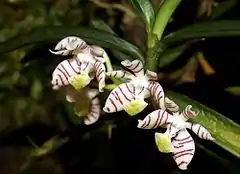 Es una planta pequeña, que prefiere el clima cálido, de hábito epifita monopodial con hojas en forma de cinta con ápice desigual bidentado y canalizado. Florece en el otoño y el invierno en una inflorescencia axilar, que abre sucesivamente con hasta 3 flores ligeramente fragantes.[1]