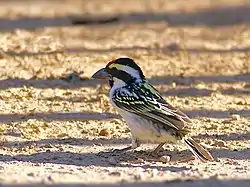Tiene la cabeza listada en blanco y negro, con la frente roja y una mancha amarilla encima de los ojos y la garganta negra. Las partes inferiores de su cuerpo son blancas y las superiores listadas en color pardo oscuro y amarillo claro.