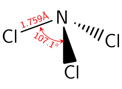 Como el amoníaco, el NCl3 es una molécula piramidal. Las distancias entre el nitrógeno y los átomos de cloro es de 1.76 Å, y entre Cl-N-Cl los ángulos son de 107°.[2]