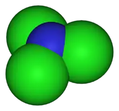 El Tricloruro de nitrógeno, también conocido como tricloroamina, es un compuesto químico con la fórmula NCl3. Es un líquido amarillo grasiento de olor penetrante, que generalmente aparece como subproducto de reacciones químicas entre el cloro y derivados de amoníaco (por ejemplo, en las piscinas).