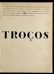 Troços fue una revista catalana de vanguardia publicada por primera vez en 1916, dirigida por Josep M. Junoy, quien al mismo tiempo era el propietario. En este primer momento se editó únicamente un número, del cual se hicieron 101 copias. Este número tenía 8 páginas y unas dimensiones de 223 x135 mm. Su impresión era de gran calidad y se hacía en la casa Oliva de Vilanova. Su precio era de 2,50 pesetas.[1]