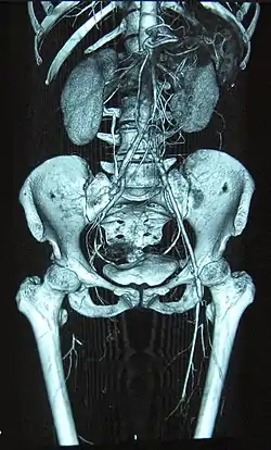 ![]() Oclusión completa de la arteria femoral derecha y estenosis de la arteria femoral izquierda como se observa en un caso de tromboangitis obliterante | ||
