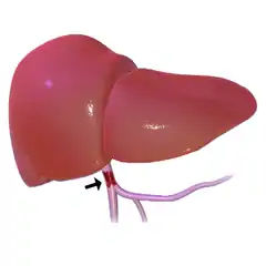 ![]() Esquema del hígado, la flecha señala una trombosis de la vena porta hepática. | ||