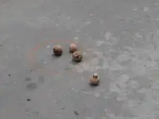- Punta de garbanzo o punta chata o puya zaíta[17] Es la punta del trompo que tiene forma redondeada.[17] Su forma permite que sea más difícil el que se entierre en terrenos blandos o que se meta dentro del cuerpo, pero aumenta el rozamiento disminuyendo la duración del efecto giroscópico. Además resulta en clara desventaja a la hora de realizar juegos como el rompetrompos, aunque por otro lado resulta más seguro y daña menos el suelo.