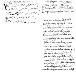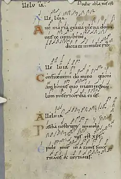 La notación empleada consta de 16 líneas de texto en cada cara, con neumas no diastemáticos ingleses; letras significativas; notación de letras "instrumentales"; los textos de secuencia parcial incrustados en dos prosae están escritos en mayúsculas rojas (véase Frere, pp.69, 84).[1]