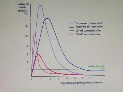 Cuando hay detección de niveles superiores de troponina podemos determinar que ha habido daño en el corazón. En el caso de que se haya producido un ataque cardíaco, los niveles de troponina aumentaran mucho al cabo de 6 horas y serán detectables en el paciente 12 horas después de haberlo experimentado (con un máximo en los niveles aproximadamente a las 24 horas). Además, los elevados niveles de troponina en estos casos se pueden prolongar hasta dos semanas. También se debe tener en cuenta que cuanto mayores sean los niveles, más riesgo de complicaciones o incluso de muerte tendrá el paciente.[11]