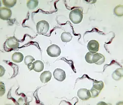 ![]() Trypanosoma brucei brucei TREU667 (forma sanguínea, imagen por contraste de fase), la barra mide 10 µm. | ||