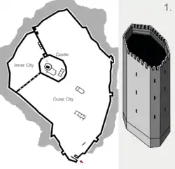 La ciudad fue construida sobre alturas escarpadas de 1.136 metros sobre el nivel del mar. Sus muros exteriores cierran una superficie de 25 decáreas y fueron dominados por una ciudadela ubicada en la parte superior del acantilado. Los cimientos de las tres iglesias han sido excavados, así como cuatro grandes tanques de almacenamiento de agua de hasta 10 m de profundidad.