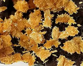 Hábito cristalino | Costras de cristales prismáticos radiados en forma de estrella y esferulitas | |