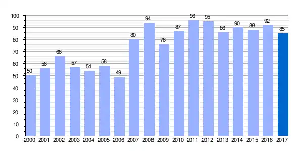 Gráfica de evolución demográfica de Tuesta[1] entre 2000 y 2017 |