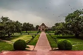 La entrada al mausoleo se realiza a través de dos puertas masivas de piedra y mampostería enfrentadas (al norte y al sur) que conducen a un recinto cuadrado cerrado conocido como el Akbari Serai. Este recinto lleva a otro, en el lado occidental, que propicia ya una vista completa del jardín dispuesto frente al mausoleo, que es atravesado por cuatro canales de ladrillo procedentes del centro, y en los que se dispusieron numerosas fuentes que ahora están en ruinas.