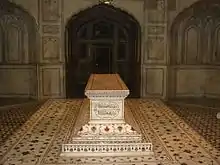 En el interior del mausoleo está en una posición elevada el sarcófago de mármol blanco, en cuyos laterales hay delicadas y coloridas flores en pietra dura, en el mismo estilo elegante de las tumbas en el Taj Mahal en Agra, India. En los dos lados del sarcófago están incrustados en negro los noventa y nueve atributos de Dios. Una jali de mármol blanco, una pantalla perforada con varios motivos, permite que entre la luz mirando hacia La Meca.