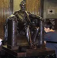 El interior del monumento, construido con mármol de Minnesota, Misuri, Massachusetts, Arkansas, Utah, Italia, España, Francia y Bélgica, tiene una rotonda, una sala funeraria y pasillos de conexión. Un prototipo de bronce a escala reducida de Daniel Chester French de su estatua de 1920 en el Monumento a Lincoln, en Washington, D. C., domina el vestíbulo de entrada. Las paredes de la rotonda están decoradas con 16 pilastras de mármol, que están separadas por paneles de mármol. Las pilastras simbolizan a Lincoln y los 15 presidentes que lo precedieron.[6] La sala también tiene 36 paneles de bronce, uno para cada estado en el momento de la muerte de Lincoln. El techo es de hoja de paladio.