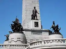 En el centro de la terraza, una base grande y ornamentada sostiene el obelisco. En las paredes de la base hay 40 piedras labradas, cortadas para representar escudos levantados, 37 están grabadas con la abreviatura de un Estado en el momento en que se construyó la tumba. Los 3 restantes están marcados U, S, A. Cada escudo está conectado a otro por dos bandas elevadas, y así el grupo forma una cadena ininterrumpida que rodea la base. Cuatro estatuas de bronce adornan las esquinas de este último. Representan a la infantería, la armada, la artillería y la caballería del período de la Guerra de Secesión. Frente al obelisco y sobre la entrada se encuentra una estatua de Lincoln de cuerpo entero. El arquitecto y escultor de diseño de la tumba, Larkin G. Mead, diseñó y ejecutó estas tallas y estatuas.[5]