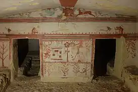 La entrada a la tumba conduce a la cámara principal. La pared trasera de esta cámara, frente a la entrada, contiene dos puertas que conducen a otras dos cámaras. [5] Hay frescos con animales de colores brillantes que adornan las áreas a dos aguas en la parte superior de las paredes delantera y trasera de las cámaras. Estos incluyen toros, pájaros, hipocampos, una pantera, un león y una cabra. La pared trasera de la cámara principal es la única pared con frescos pintados debajo del hastial.