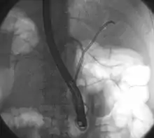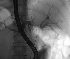 ![]() Tumor de Klatskin durante ERCP. El paciente yace sobre su estómago de manera oblicua, por tanto el lado izquierdo de la imagen corresponde al lado izquierdo del paciente. A la izquierda y derecha del sistema biliar se coloca un cable que es necesario para las posteriores inserciones de stents para drenar la bilis. | ||