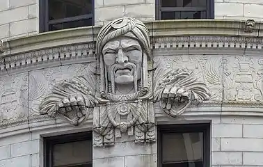 - El mascarón de proa con turbante que adorna el frente del edificio.