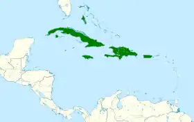 Presente en Cuba, La Española, Jamaica, Puerto Rico, Bahamas y las Islas Caimán. Vive en bosques, manglares e inmediaciones de ciénagas, arboledas fluviales.