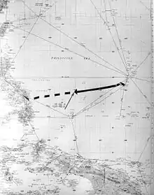 Hashimoto transmitió por radio un mensaje en clave que indicaba el hundimiento de un crucero pesado enemigo entre Guam y Leyte. La comandancia de la VI Flota del Japón desestimó el mensaje; este mensaje también fue escuchado por los estadounidenses y no dieron crédito, ya que al igual que lo desestimó el Alto Mando japonés, no se estaba informado de ningún crucero en esa área.