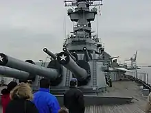 original: • 9 Cañones Mark 7 de 406 mm/50 (16") • 20 Cañones Mark 12 de 127 mm/38 (5") • 80 Cañones bofors AA de 40 mm/56 • 49 Cañones oerleikon AA de 20 mm/70 modernización 1984: • 9 Cañones Mark 7 de 406 mm/50 (16") • 12 Cañones Mark 12 de 127 mm/38 (5") • 32 misiles de crucero BGM-109 Tomahawk • 16 misiles antibuque RGM-84 Harpoon • 4 CIWS Phalanx 20 mm/76 | |