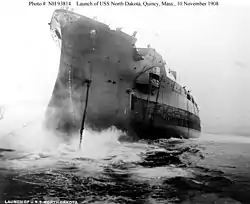 La quilla del USS North Dakota fue colocada en el astillero Fore River Shipyard, en Quincy, Massachusetts, el 16 de diciembre de 1907, y fue botado el 10 de noviembre de 1908. Después de finalizado el trabajo de acondicionamiento, la embarcación fue puesta en servicio con la Flota del Atlántico el 11 de abril de 1910.[5][6][1] Participó en cruceros rutinarios de tiempos de paz, maniobras con la flota, y simulacros de artillería en el Atlántico y el Caribe. El 2 de noviembre de 1910, cruzó el Atlántico en un viaje de buena voluntad para visitar el Reino Unido y Francia.[5] Continuó con maniobras en el Caribe durante la siguiente primavera. Realizó dos cruceros de entrenamiento para guardamarinas de la Academia Naval los veranos de 1912 y 1913. En enero de 1913, se unió a la escolta del crucero acorazado HMS Natal, que transportaba los restos de Whitelaw Reid, embajador estadounidense para la Gran Bretaña.[5][6][7]