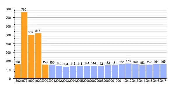 Población de derecho (1802-1920), según los censos de población de la Enciclopedia Auñamendi. población residente (2000-2017) según los censos de población del INE. (Supuesto demográfico si el municipio todavía existiera). |