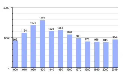 Gráfica de evolución demográfica de Udías entre 1900 y 2019