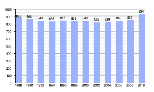 Gráfica de evolución demográfica de Udías entre 1988 y 2019