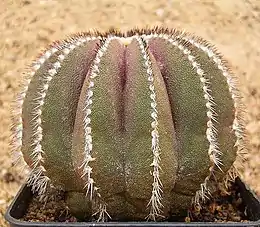Tiene un tallo de no más de 2 dm de diámetro y 5 dm de altura; 15 a 18 prominentes costillas; 1 a 4 espinas centrales, de 15 mm de largo, rectas y con una comba.