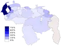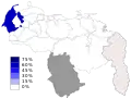 - Porcentaje de votos de UNT dentro de la coalición opositora en las elecciones regionales de Venezuela de 2008. El estado Amazonas (en gris), no participó.