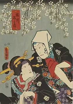 ![]() Umegawa y Chūbei en la escena "La aldea Ninokuchi" de "Un mensaje de amor desde Yamato". Ukiyo-e de Utagawa Kunisada. | ||