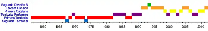 Tras la Guerra Civil, comienza a militar en la Segunda Regional catalana, para transitar hasta 1991 entre las categorías de Primera Regional y la Preferente catalana, año en que consigue su primer ascenso a la Tercera División. En la temporada 1992-93 consigue un histórico ascenso (el más importante de su historia) a la Segunda División B tras rematar en tercer lugar. En la tercera categoría española se mantiene solo por un año y desciende.