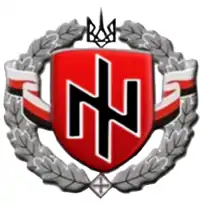El escudo de la Unión Nacional de Ucrania cuenta con un wolfsangel. El escudo consta de un rojo lienzo con la wolfsangel en color negro. El wolfsangel es usada por el neonazismo a nivel internacional[14]. La bandera consta de tres bandas, donde franja blanca simboliza la raza, raya roja simboliza la nación, una raya negro simboliza la tierra - un país. Lema: ¡Raza! ¡Nación! ¡Tierra![15]