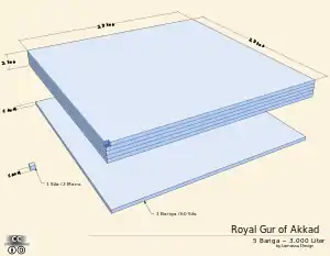 Una mejora importante llegó en 2150 a. C. durante el imperio acadio bajo el reinado de Naram-Sin cuando se unificaron los diferentes sistemas con un estándar único oficial, el cubo gur real.[2] Su reforma se considera el primer sistema de medida estandarizado en Mesopotamia. El cubo gur real (en cuneiforme: LU2.GAL.GUR, 𒈚𒄥; en acadio: šarru kurru) era un cuboide teórico de agua de aproximadamente 6m × 6m × 0.5m del que se podían derivar todas las demás unidades. Los neosumerios continuaron usando el cubo gur real como se indica en la carta de Nanse, escrita por Gudea en el 2000 a. C. El uso de este mismo estándar continuó a través de los imperios babilónico, asirio y persa.