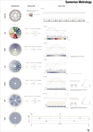 En la Dinastía Arcaica Sumeria (c. 2900–2300 a. C.) la metrología y las matemáticas eran indistinguibles y se tratabal como una única disciplina escribana. La idea de un número abstracto aún no existía, por lo que todas las cantidades se escribían como símbolos metrológicos y nunca como numerales seguidos por un símbolo de unidad. Por ejemplo, existía un símbolo para una oveja y otro para un día, pero ninguno para uno. Existen alrededor de 600 de estos símbolos metrológicos, por esta razón la metrología sumeria arcaica es compleja y no se entiende completamente.[1] En general, sin embargo, la longitud, el volumen y la masa se derivan de un cubo estándar teórico, llamado 'gur', lleno con cebada, trigo, agua o aceite. La masa de un cubo-gur, llamada 'gun2' se define como el peso que puede cargar un burro de carga. Sin embargo, debido a las gravedades específicas de estas sustancias combinadas con bases numéricas duales (sexagesimal o decimal), se usaban distintos tamaños del cubo-gur sin consenso. Los diferentes cubos-gur se relacionan por proporción, basada en el cubo-gur de agua, de acuerdo a cuatro coeficientes básicos y sus raíces cúbicas. Estos coeficientes se dan como: