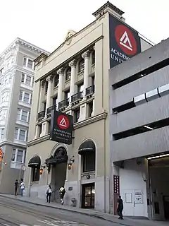- Esta obra contiene una traducción derivada de «Academy of Art University» de Wikipedia en inglés, publicada por sus editores bajo la Licencia de documentación libre de GNU y la Licencia Creative Commons Atribución-CompartirIgual 3.0 Unported.