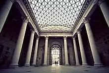 Situado tras la torre-puerta, es un patio rectangular a la manera de atrium corintio, con diez columnas de granito de diez metros y medio de altura cada una. Su objetivo, en palabras de Moya era «proporcionar la debida impresión de dignidad en el acceso a la gran plaza y preparar su escalada». Tras pasar el atrio, un acceso al patio se convierte en punto de fuga que muestra la torre y la iglesia. En la reforma de 2007 se añade un techo acristalado.[15]
