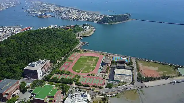 La Universidad Nacional Sun Yat-sen (NSYSU) se encuentra en la ciudad de Kaohsiung, la ciudad portuaria más grande de Taiwán. Basado en el estilo académico que enfatiza el océano y el comercio, no solo es el lugar de nacimiento de la primera facultad de ciencias marítimas de Taiwán, sino que también es único en albergar actividades de deportes acuáticos directamente en el campus. Los requisitos de graduación de NSYSU para sus estudiantes incluyen la demostración de habilidad para nadar. NSYSU también tiene una relación regular de competición de windsurf con la prestigiosa Universidad de Osaka en Japón. Además, NSYSU tiene una relación especial de escuela hermana con la Universidad de California en San Diego (UCSD) en los Estados Unidos, una universidad de investigación con un estilo académico similar, y que también se encuentra cerca de la costa. El Simposio Conjunto NSYSU y UCSD se ha celebrado en Kaohsiung y La Jolla alternativamente todos los años desde 2015.[9][10]