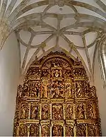 La Capilla de Sancti Spiritus posee un retablo plateresco de gran valor artístico. Su ejecución fue contratada en Valladolid en 1534 por el obispo de Ávila con el entallador Gaspar de Tordesillas, en tanto que de su dorado y estofado se debieron encargar al año siguiente los pintores abulenses Jerónimo Rodríguez y Cristóbal de Bustamante. Sito bajo una bóveda de nervadura cuadrifoliada, se trata de una pieza de cuatro alturas más predela y siete entrecalles separadas por balaustres, de traza escalonada, e imágenes exentas en lugar de relieves narrativos. Los temas centrales son la Asunción de la Virgen María, los patronos de la universidad y la villa, el Espíritu Santo y San Miguel. El tímpano es curvo, lo que da al conjunto un aspecto aovado.