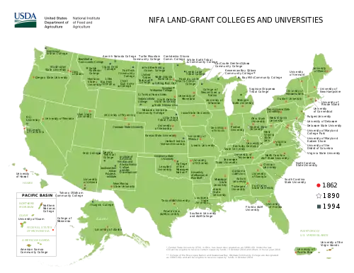 Aprobada por Abraham Lincoln, la primera Ley Morrill comenzó a financiar las instituciones educativas mediante la concesión federal de tierra a los estados para que puedan vender, para recaudar fondos, para establecer y dotar a los colegios de concesión de tierras. La misión de estas instituciones, como se establece en la Ley de 1862, es centrarse en la enseñanza de la agricultura práctica, ciencias, ciencia militar e ingeniería (aunque «sin excluir ... los estudios clásicos») como respuesta a la revolución industrial y el cambio clase social.[2][3] Esta misión contrastaba con la práctica histórica de la educación superior de centrarse en un plan de estudios de artes liberales. Una expansión de 1994 otorgó el estatus de concesión de tierras a varios colegios y universidades tribales.[4]