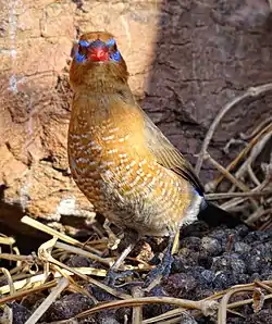 Suelen medir alrededor de 13,3 cm de largo. Ambos sexos, durante toda la vida, tienen la cola negra y los adultos el pico rojo. Los machos poseen la cabeza de color rojizo, mientras que su cuello y las manchas alrededor de sus ojos son de color azul. Sus cuartos traseros son azules al igual que su barriga que adquiere un tono morado. Las hembras son más pequeñas, de color marrón canela con manchas blancas en su pecho mientras que sus ojos están rodeados por círculos de color azul plateado. Los jóvenes son más parecidos a las hembras, aunque algo más marrones, y con un pico marrón rojizo.[3] Su filogenia fue obtenida por el español Antonio Arnaiz-Villena et al.[4]