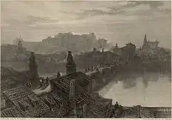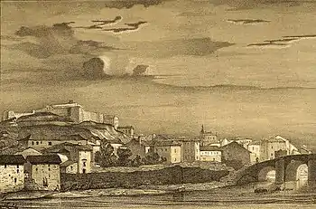 Grabado de Miranda de Ebro realizado en 1862. Se aprecia el puente medieval anterior al de 1777.