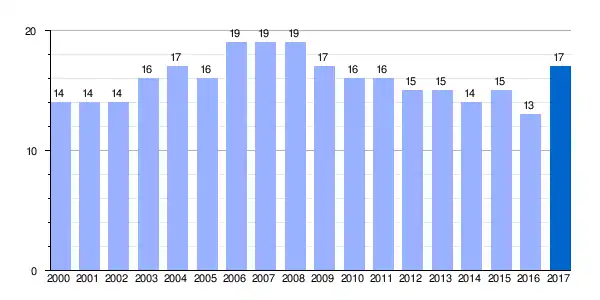 Gráfica de evolución demográfica de Urbina de Eza[2] entre 2000 y 2017 |