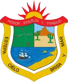 En la divisa superior, sobre fondo de gules, se lee el lema «Honor, Riqueza y Trabajo». En la divisa que rodea al escudo, sobre fondo de oro, se lee el lema «Estepa, Cielo, Brisa y Mar». Coronando el escudo, un sol naciente, símbolo del clima cálido de la región y de la esperanza y fuerza de sus habitantes.
