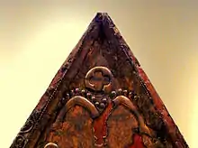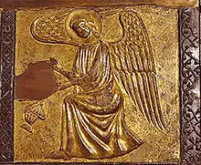 El batiente de la cubierta en la parte anterior se encuentra totalmente liso, mientras en la posterior, está dividido en tres secciones separadas por una cenefa de motivos geométricos y con decoración de entrelazados vegetales la que se encuentra en el borde total de la tapa. La parte central la cubre un Pantocrátor dentro de una mandorla rodeado por los símbolos de los cuatro evangelistas; en los compartimentos de ambos lados se encuentran dos ángeles en genuflexión portadores de un incensario (ángeles turiferarios) y mirando ambos hacia el Pantocrátor.[1]