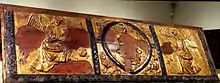 En un lateral se puede ver a un personaje sentado en conversación con otros tres que están de pie. En el otro lateral se observa un hombre en pie con otros a su alrededor que parecen soldados que lo custodian, se encuentran ante otro, desaparecido, que estaba sentado.[1]